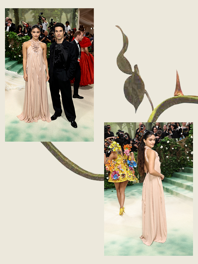 "The starting point for the design of this dress was the theme – ‘The Garden of Time’ - specifically, the idea of decay and destruction. Inspired by my research into decaying blooms, the gown I created is adorned with chiffon flowers which unravel into soft ruffles down the length of the bodice and skirt. The blush pink sequins evoke the fading color of a pink rose as it dies, while the edges of the ruffles are left raw and drawing, a nod to the idea of decay. This is a dress that is at once romantic and melancholic."